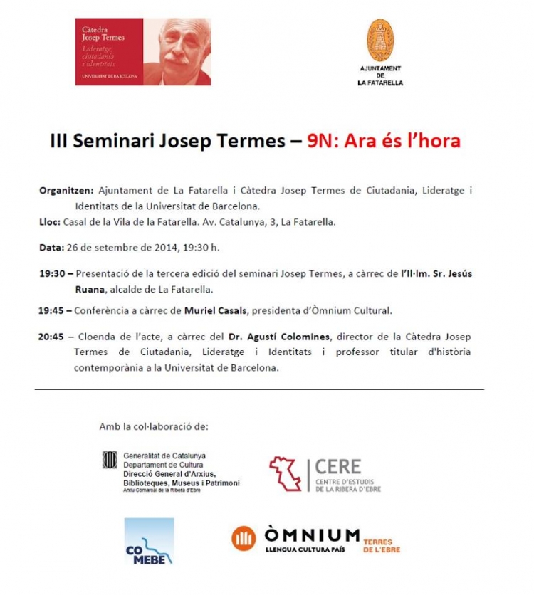 El 26 de setembre de 2014 s’ha celebrat el III Seminari Josep Termes a la Fatarella, aquest any amb el títol 9N: Ara és l’hora.