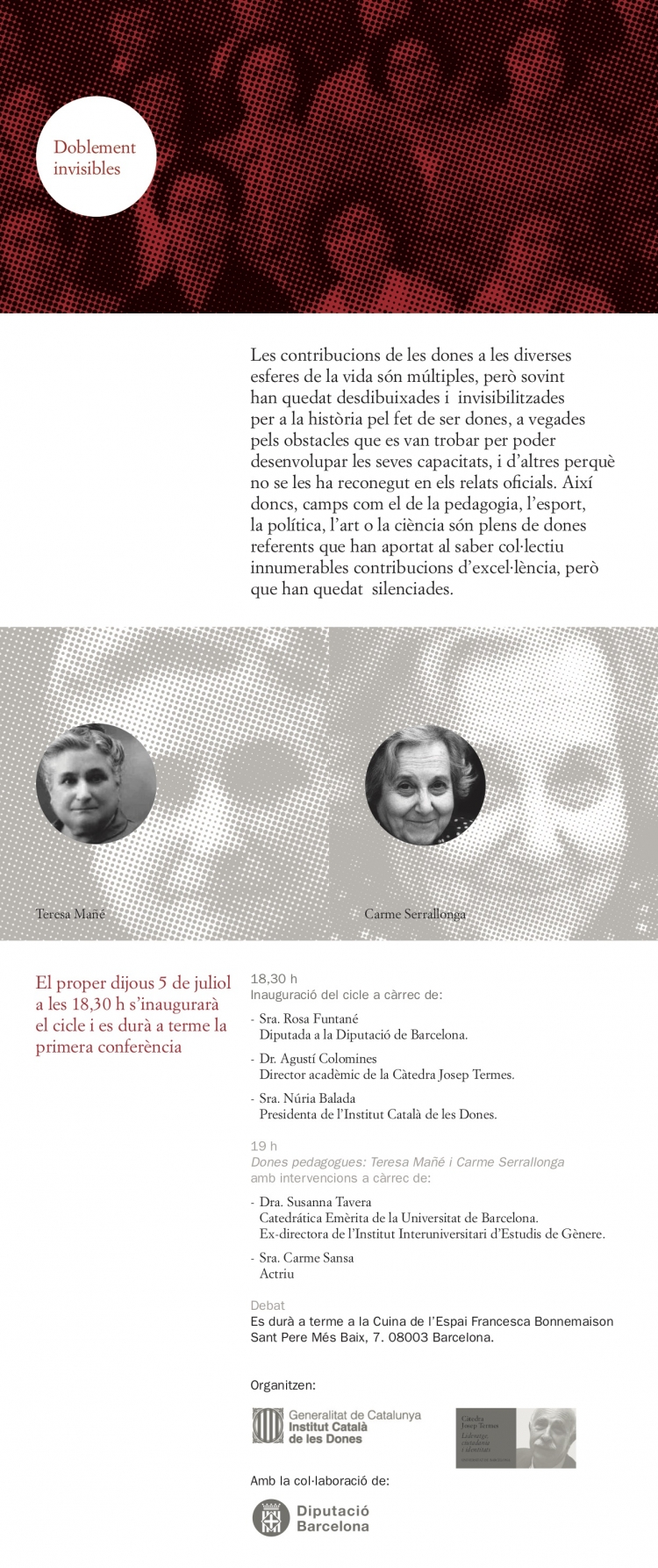 El cicle Doblement invisibles és una iciciativa conjunta de la Càtedra i l'Institut Català de les Dones, el qual compta amb el suport de la Diputació de Barcelona, a més del d'altres institucions per a cada sessió.