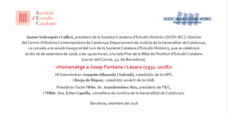 Sessió inaugural del curs de la Societat Catalana d’Estudis Històrics, que se celebrarà el dia 26 de setembre de 2018, a les 19.00 hores, a la Sala Prat de la Riba de l’Institut d’Estudis Catalans (carrer del Carme, 47, de Barcelona). Hi intervindran el Dr. Joaquim Albareda i Salvadó, catedràtic de la UPF; i el Dr. Borja de Riquer, catedràtic emèrit de la UAB. Presidiran l’acte l’Il·lm. Sr. Joandomènec Ros, president de l’IEC, i l’Hble. Sra. Ester Capella, consellera de Justícia de la Generalitat de Catalunya. Per assistir-ho cal confirmar-ho. Cliqueu aquí