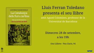 Amb motiu de la presentació del nou llibre del professor de la UAB Lluís Ferran Toledano, La Catalunya dels furs carlins, el nostre director, Agustí Colomines, el presentarà a Ona Llibres el dia 28 de setembre, a les 19. El llibre, publicat per l'editorial Rosa dels vents, és un altre lliurament de la col·lecció "Dies que han fet Catalunya" que dirigeix el vicerector de la UB Agustí Alcoberro.