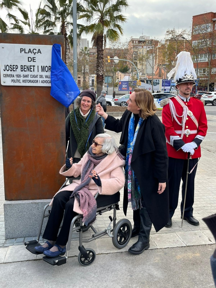 A l'acte hi ha assistit la vídua de Benet, Florència Ventura, de cent un anys, la qual, com han constatat els que han intervingut en aquest acte, va ser el puntal del senador més votat a tot l'estat en les eleccions de 1977, les primeres després de la mort de Franco. La senyora Ventura ha descobert la placa des de la seva cadira de rodes, al costat de l'alcaldessa de Barcelona. Una plaça, per cert, que només dona nom a un espai que no té cap adreça postal, perquè no té cap edifici limítrof, llevat de l'entrada de l'estació.