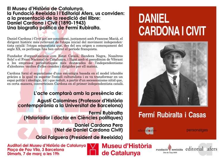 Daniel Cardona Civit (1890-1943) era un dels màxims dirigents del moviment independentista català. Fundador, amb Francesc Macià, d'Estat Català (1922), i, posteriorment, de Bandera Negra (1925), Nosaltres Sols! (1931) i el Front Nacional de Catalunya (1940) històric, Cardona va defensar una acció política del separatisme català d'acord amb el model irlandès, més polític que no pas culturalista, que és el que havia dominat en l'etapa del denominat catalanisme contemplatiu. La biografia, publicada per primera vegada el 2008, és obra de la feina de l'investigador Fermí Rubiralta, un dels grans especialistes sobre la història de l'independentisme català. La presentació comptarà amb les intervencions de l'autor, del nostre director, el professor Agustí Colomines, i del net de Cardona, Daniel Cardona Pera.