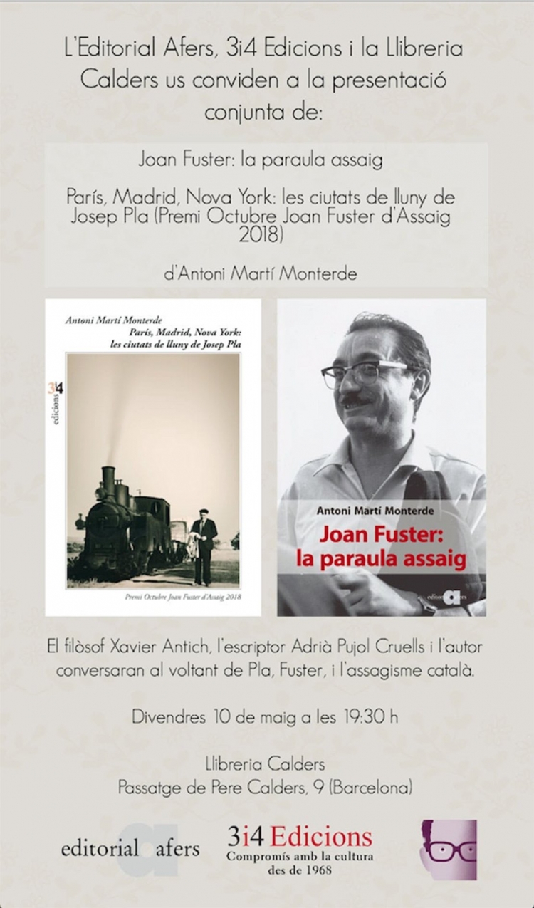 Dr. Antoni Martí Monterde, professor of Literary Theory and Comparative Literature at the Department of Hispanic Philology, Theory of Literature and Communication of the University of Barcelona and leading investor of the Grup de Recerca de Literatura Comparada en l’Espai Intel·lectual Europeu (LC:eIE), presents on Friday 10 May 2019, at La Calders bookstore, his last two books. In Joan Fuster: la paraula assaig (Editorial Afers), the author makes an approach to the humanist essay by Fuster and emphasizes his originality, as well as inserting his work into the sociology of culture up to meditation on Catalan culture in the framework of European cultural identity. In PParís, Madrid, Nova York: Les ciutats de lluny de Josep Pla (Editorial 3i4), Martí Monterde focuses on two very specific moments, in the 1920s and 1950s, when Pla projected on the cities visited a landscape view, and it gives off a poetic of the displaced writing, even a sociology of the city, the own and the stranger.